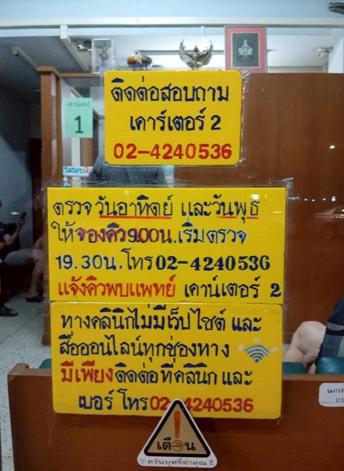 เลขที่ 107/45 ถนนพระปิ่นเกล้า เชิ่งสะพานพระปิ่นเกล้า กรุงเทพฯ โทร. 02-424-0536 เวลาเปิด-ปิด ทำการ 15:00 - 21.30 น. (เวลาใหม่) หยุดทุกวันเว้นวันเสาร์ -คุณหมอจะตรวจรักษาเฉพาะ วันอาทิตย์ กับ วันพุธ เท่านั้น